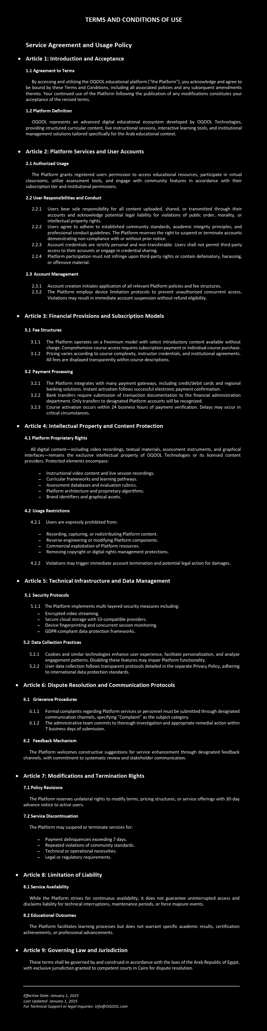 Terms of Service & User Agreement - OQOOL Educational Platform